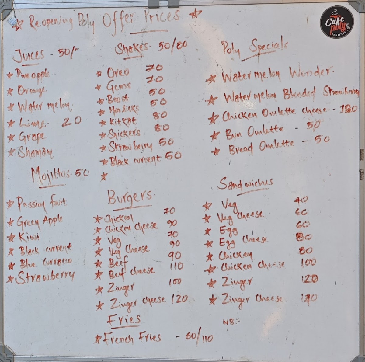 Welcome to Cafe Polytechnic, a delightful cafe nestled in Chavadimukku, Sreekariyam, Thiruvananthapuram. This charming spot has quickly become a favorite among locals, boasting a cozy atmosphere perfect for relaxation or catching up with friends. The menu features an impressive selection of milkshakes, including unique options like the Watermelon Wonder Shake and Oreo Shake, each priced affordably.